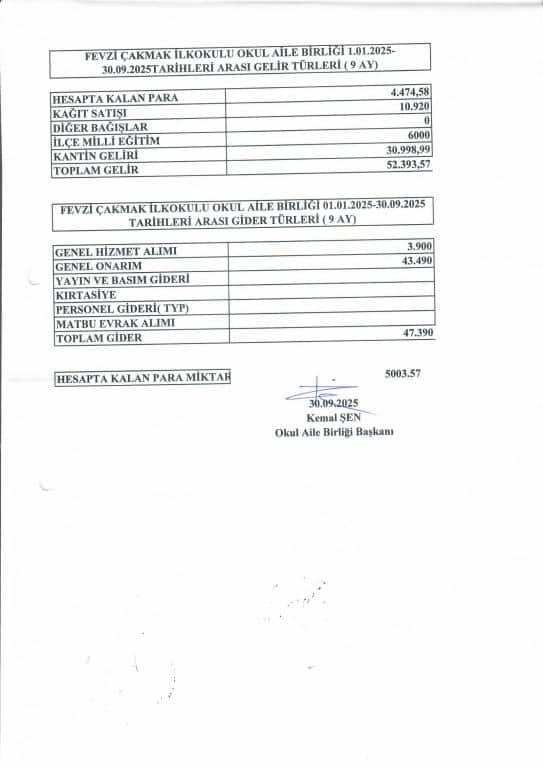 FEVZİ ÇAKMAK İLKOKULU OKUL AİLE BİRLİĞİ 01.01.2025-30.09.2025 TARİHLERİ ARASI GİDER TÜRLERİ ( 9 AY)